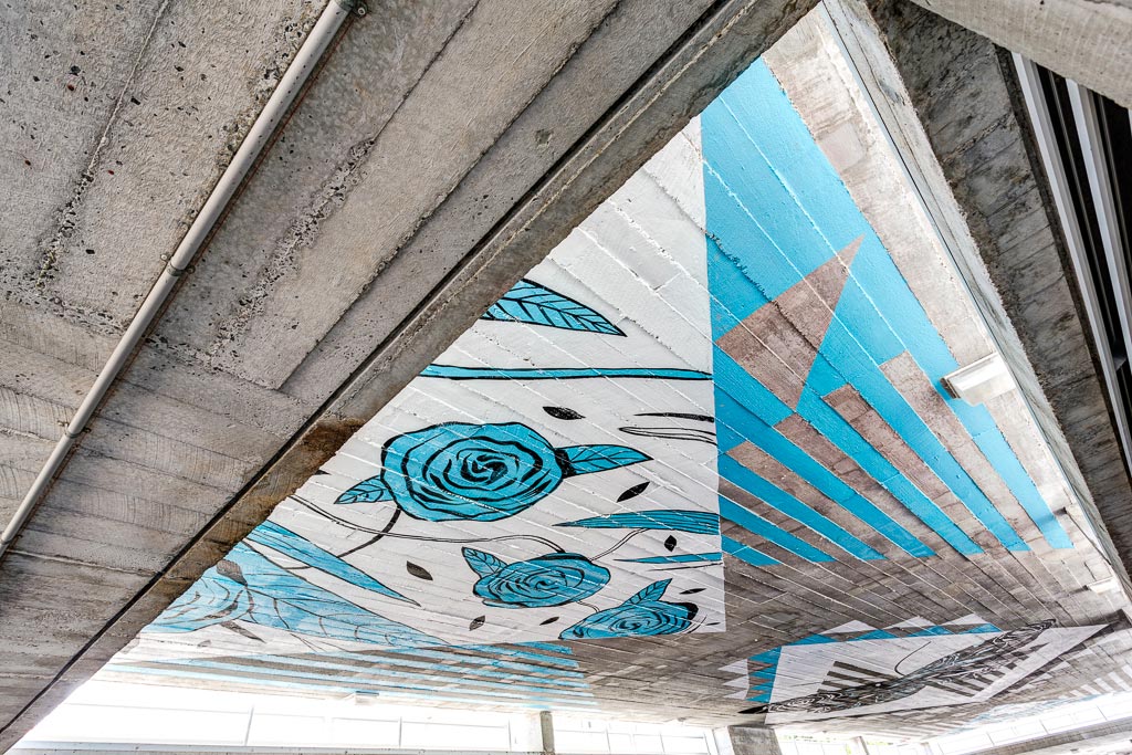 The design takes inspiration from the green linkages occuring along the coast from Perth up to Clarkson and Mindarie. The artwork displays migration pathways of the endangered Carnaby’s Black Cockatoos on the left and Seagulls on the right to show the contrast from the bushland to the coast. Big thanks to Mindarie Primary School where we created a series of workshops which inspired the background abstract forms, taking reference from their experience of the local surrounds.