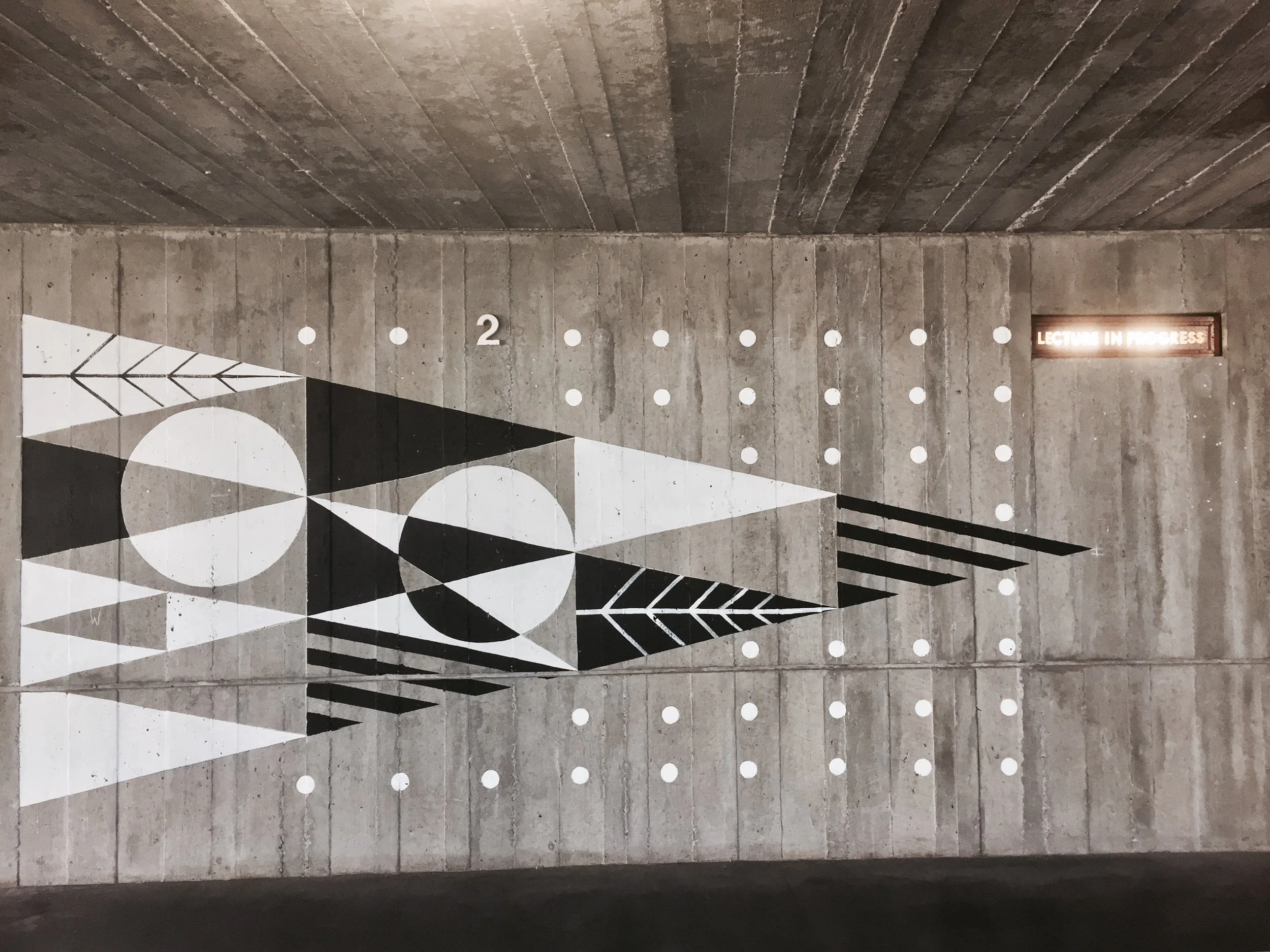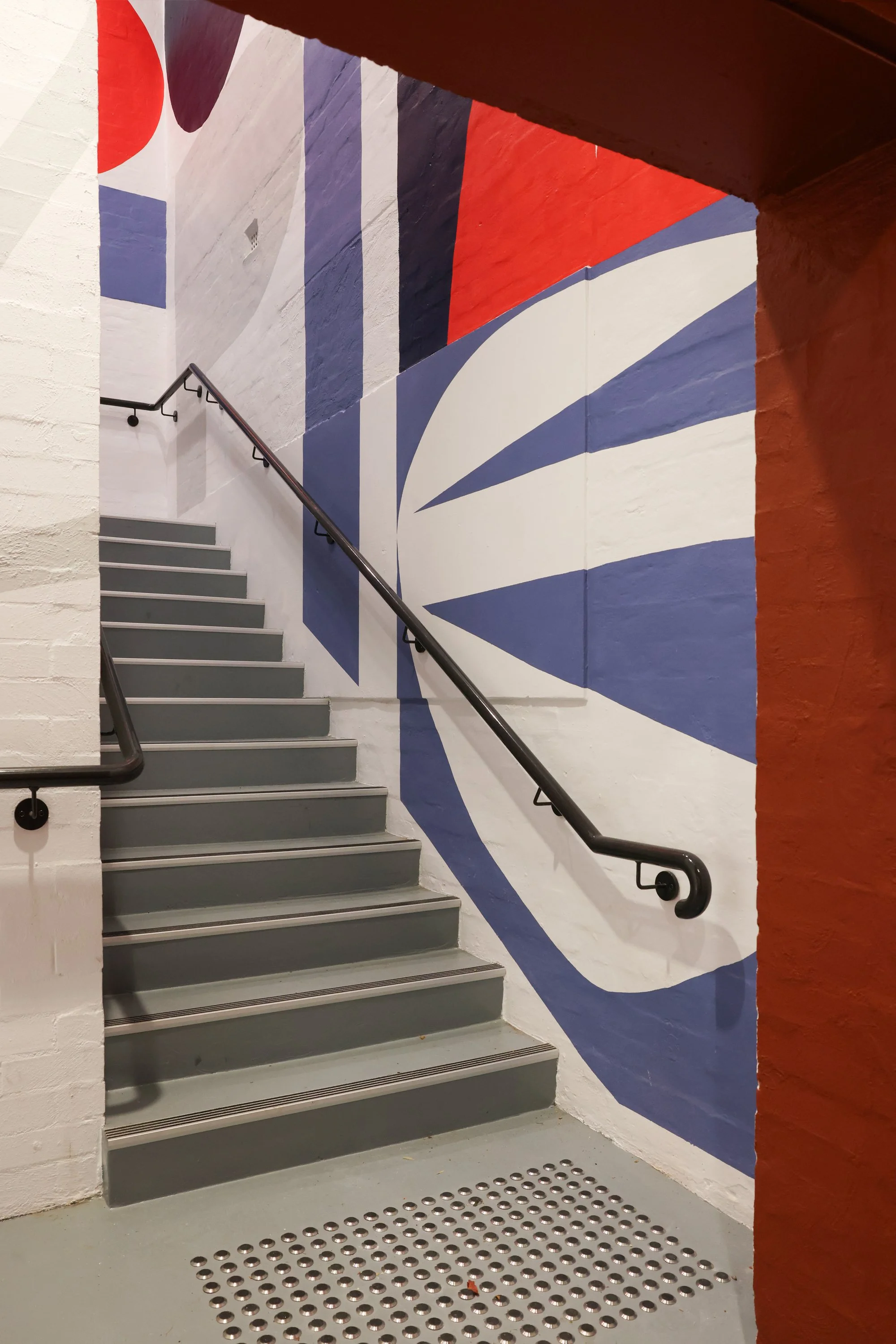 Mural artwork depicting local flora, fauna and industry through abstract patterns and textures, with the lettering grounding the artwork to the specific site. The sculptural aluminium letters have LED strip lighting fixed to the back to illuminate from behind. By day the letters cast shadows to map time, while at night animated programmed lighting sequences react to lunar phases to to continue the tracking of time - from shadows to illumination for a complete 24hr loop.